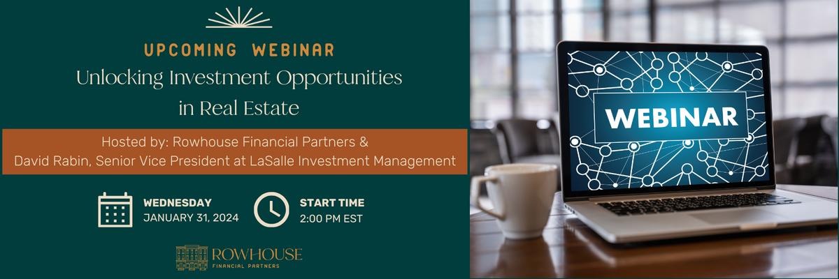 As your neighborhood resource for money matters, we are excited to invite you to an exclusive webinar, "Unlocking Investment Opportunities in Real Estate," featuring our own Joseph Palumbo, CFP®, CPA, Financial Advisor, and Partner at Rowhouse Financial Partners, and David Rabin, Senior Vice President at LaSalle Investment Management.